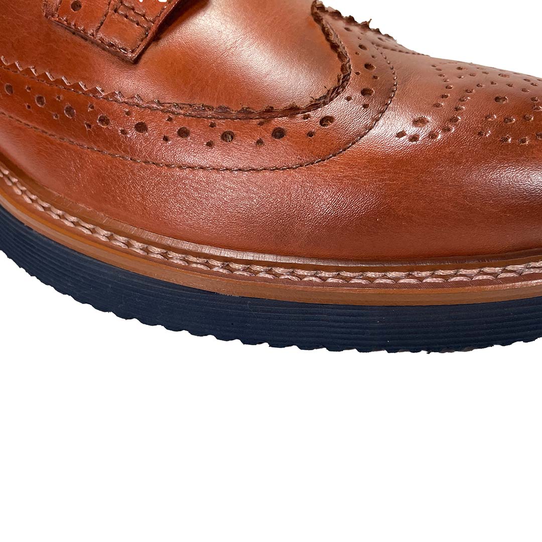 Tan brogues men's leather shoes with blue soles. The Bexley is a classic long wing full brogue style, in a casual burnished tan leather and a lightweight (yet durable) blue textured EVA sole with a premium storm welt that has double row of stitching. These smart, comfortable shoes are perfect for all day wear and will look great with jeans or chinos.