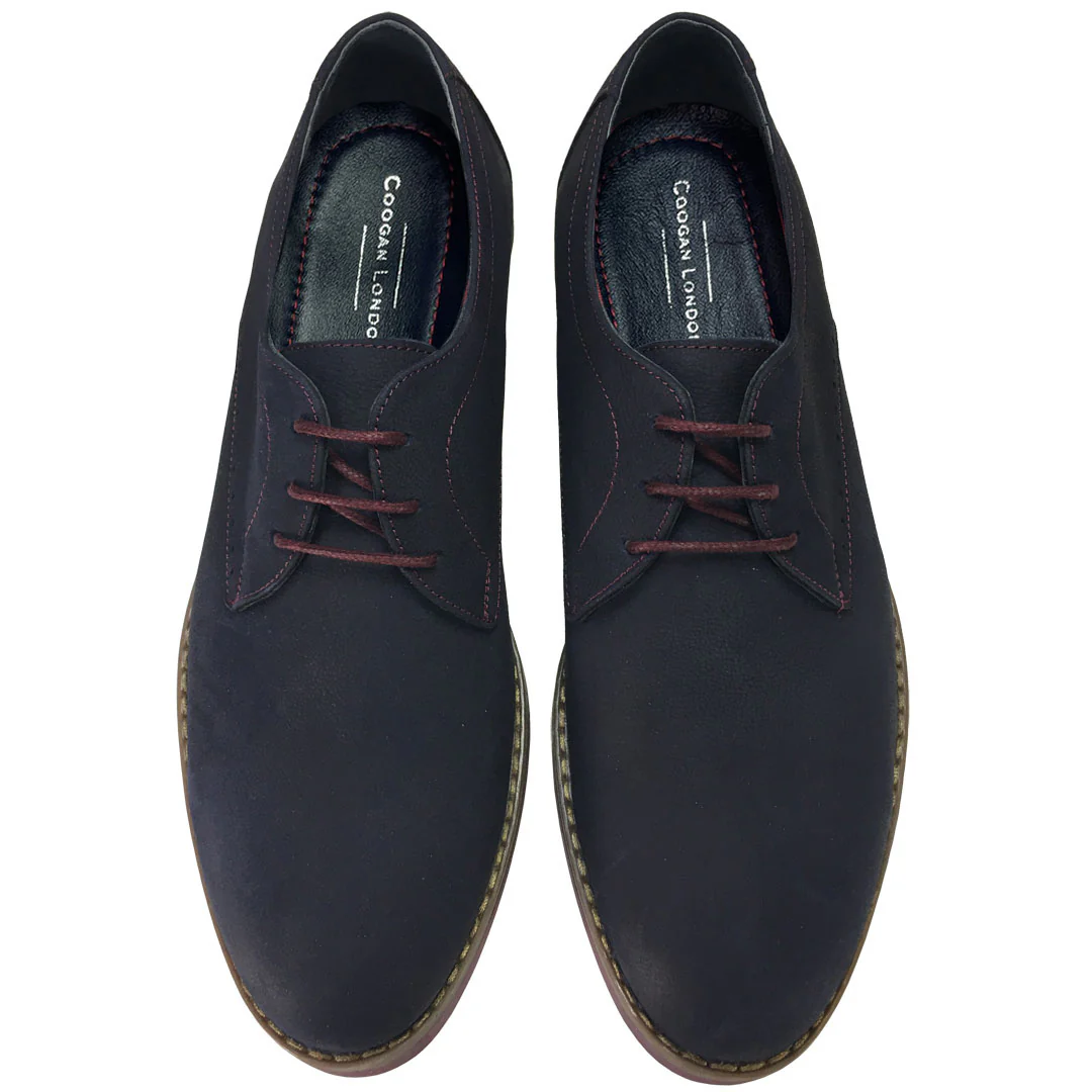 Men's blue leather Derby shoes with burgundy soles. Featuring subtle broguing, the Edgware is an all new smart-casual Derby lace up style in a milled waxy navy blue leather, with contrast burgundy stitching and laces to match with the burgundy sole. Comfortable for everyday wear. Great with jeans or chinos.