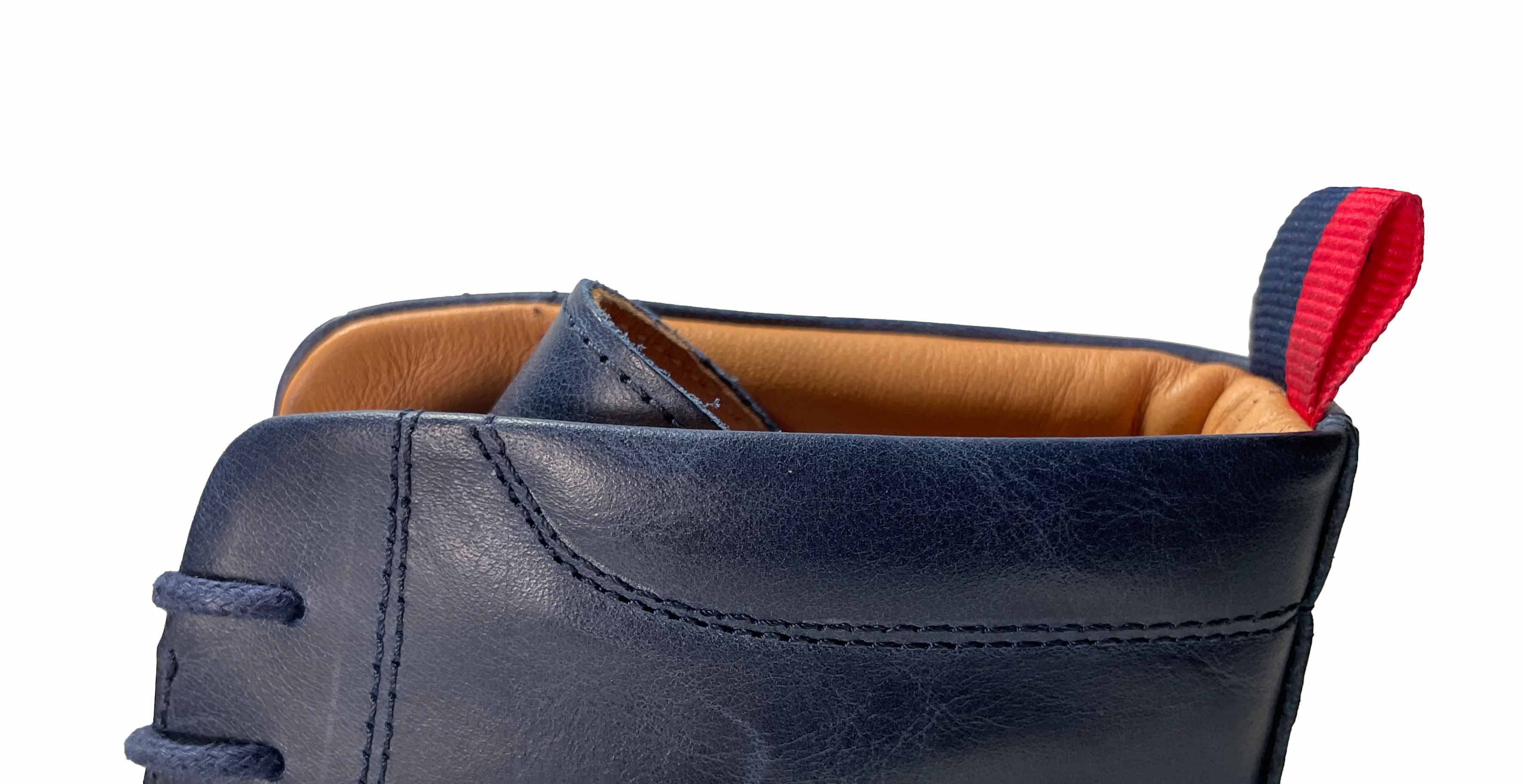 Men's blue leather boots. The Enfield is a plain front Derby style boot made in a casual navy blue leather. The boots have a nicely sculpted upper, soft leather lining, padded collar and a lightweight cleated sole that is durable and comfortable (a layer of midsole in a navy blue colour to match with the leather has also been added for that extra comfort). Smart and versatile enough to wear to work, or for smart casual occasions.