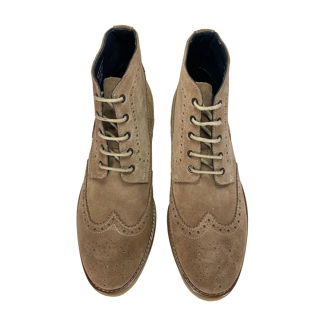 Men'sĀ sand suede brogue boots with natural crepe soles. A brogue wingtip version ofĀ theĀ desert boot, the Loughton featuresĀ aĀ soft sand suedeĀ leather with off-white laces,Ā and aĀ natural crepe rubber sole. These stylish, comfortable boots are ideal for every day wear. Great with jeans or chinos.