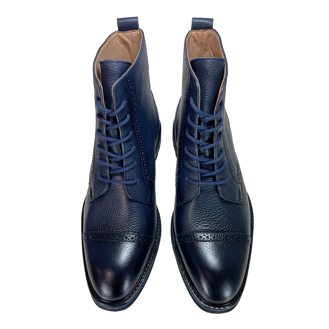 Men's blue leather brogue boots. The Woodford is a Derby style boot with a capped toe and brogue detailing, made in a navy blue grain leather that has been lightly hand finished and stained to a contrasting burnish. The boots have a nicely sculpted upper, soft calf leather lining and a lightweight cleated sole that is durable and comfortable (a layer of midsole in a blue colour to match with the leather has also been added for that extra comfort). Smart and versatile enough to wear to work, or for smart casual occasions.
